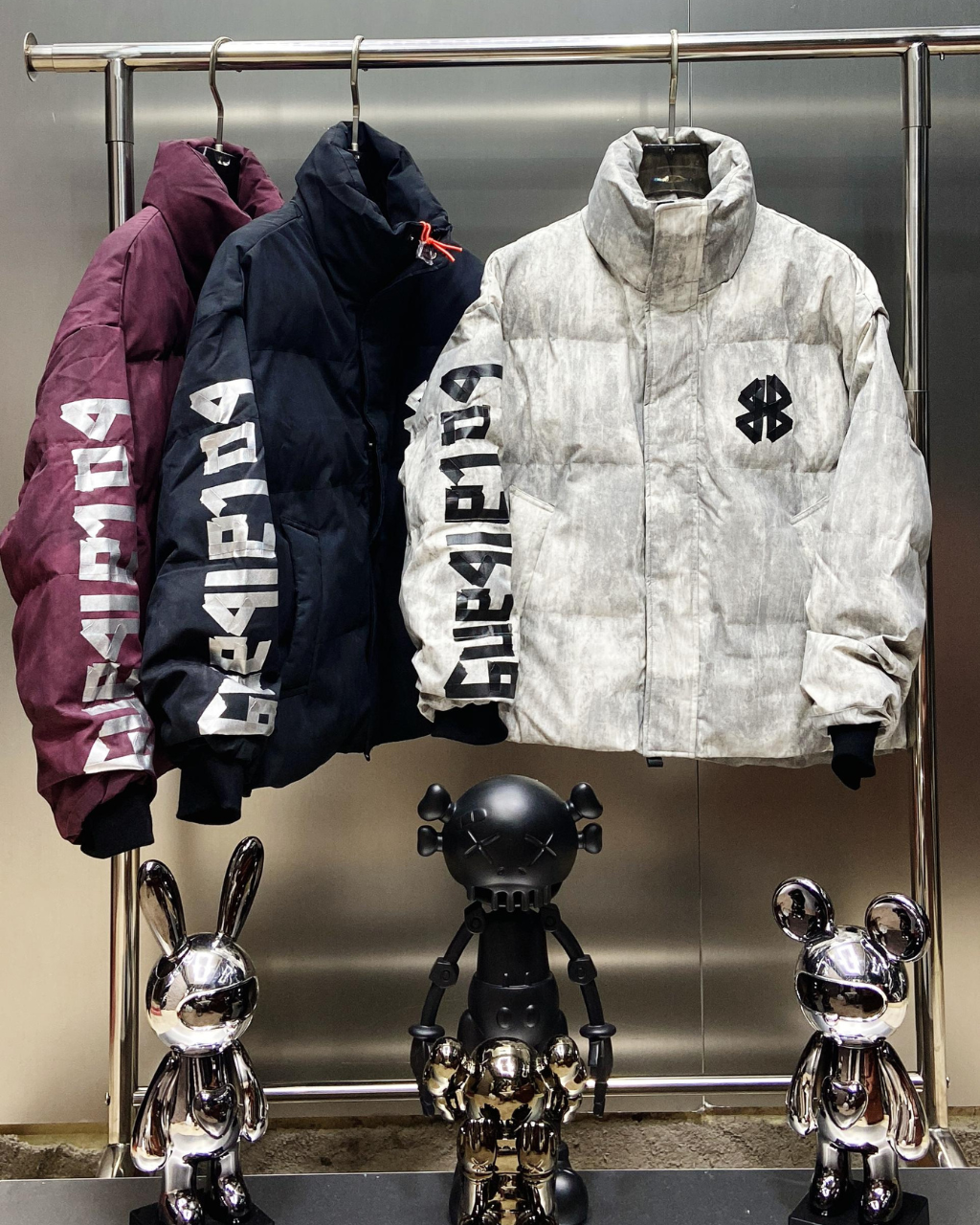 A pair of stylish puffer jackets: one in black with a textured/marbled print, and the other in a crinkled tan/brown with a large logo print on the back.