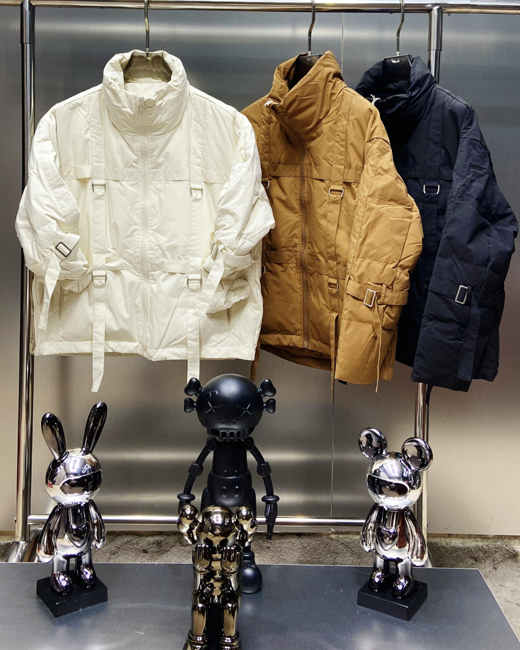 A winter puffer jacket with a tactical-inspired design, featuring wide straps and buckles for unique and functional details, available in three colors.